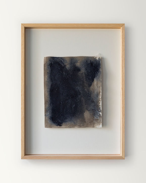 Throughout the series, Tejfel employs a restrained, natural palette: shades of gray, raw earth tones, and various nuances of black. These materials and hues are not merely formal choices but conceptual carriers as well—the dark surfaces evoke the depths of the mind, while the sand and coral fragments suggest the constant flux, fragility, and layering of thought processes. The ocean water used in the paintings, along with the patterns of the waves, introduce motifs of release and transformation into the works. Together, the materiality and gestural language construct an interior space in which solitude is understood not as isolation, but as an intensified state of conscious presence. The series encourages reading solitude not as a lack, but as a reflexive condition—an opportunity to deepen one’s connection with the self.